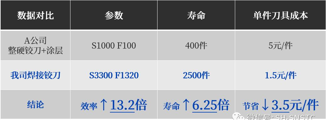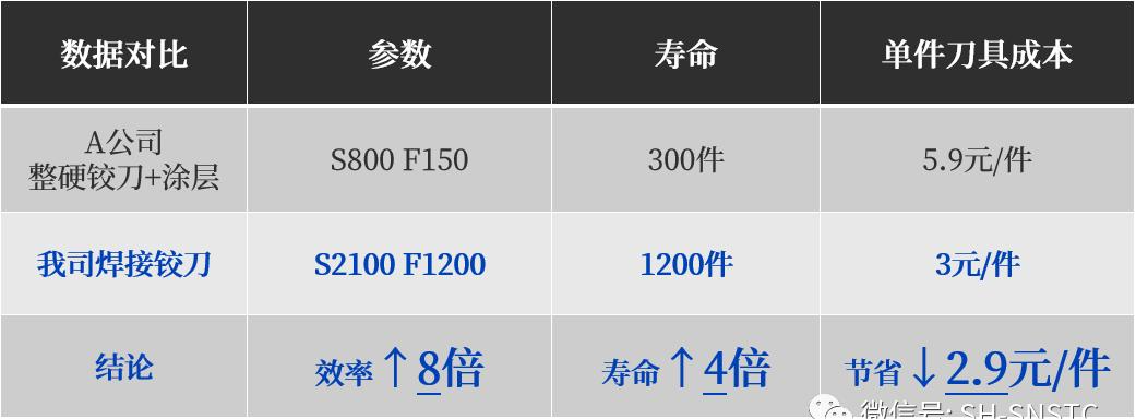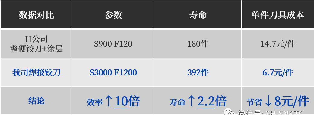 通過(guò)客戶實(shí)測(cè)對(duì)比,我司焊接鉸刀加工D14.5孔位,孔壁粗糙度明顯優(yōu)于A公司整硬鉸刀,同時(shí)加工效率和使用壽命均遠(yuǎn)遠(yuǎn)超過(guò)原有方案,加工效率提升了13.2倍,壽命提升6.25倍,單孔鉸加工刀具成本下降70%,得到了客戶的高度認(rèn)可!
